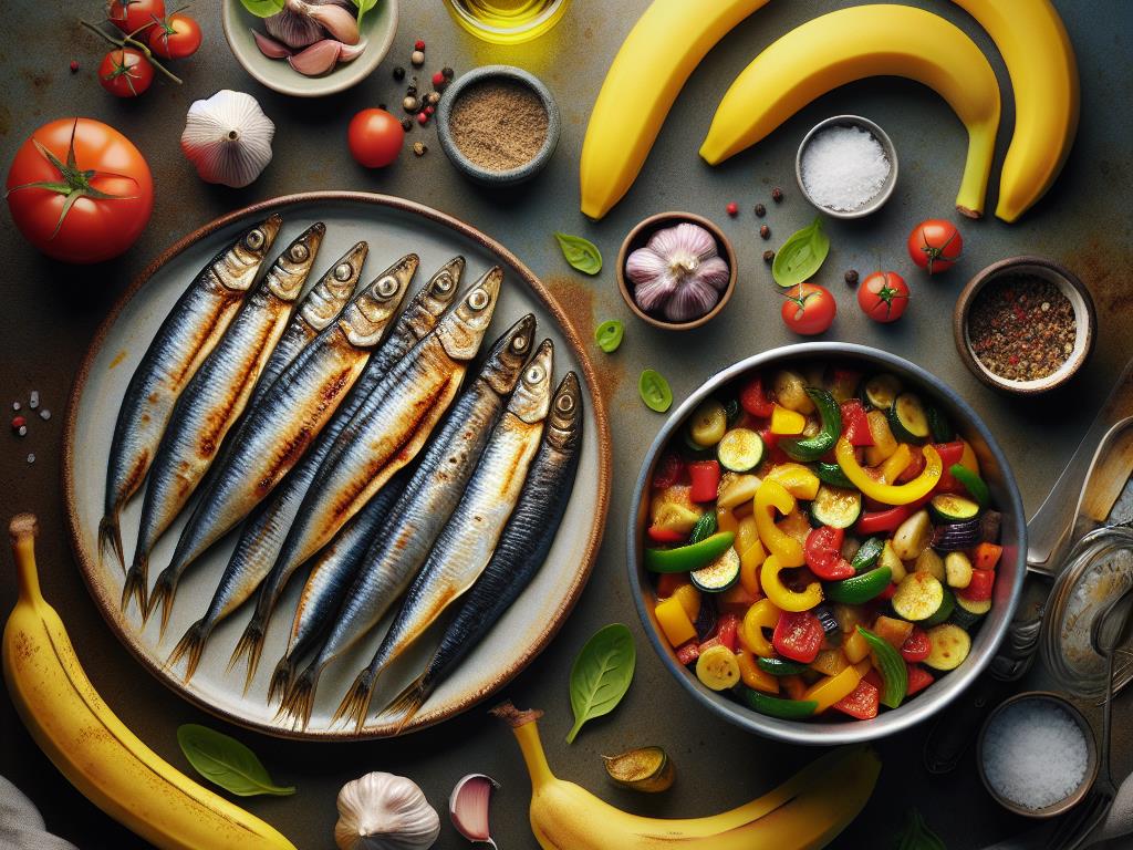 Ce plat combine la richesse en oméga-3 des anchois avec les bienfaits des légumes de la ratatouille, le tout complété par une banane pour une touche sucrée et une bonne dose de potassium. C’est un repas équilibré qui offre une belle variété de nutriments essentiels, parfait pour un dîner léger et nutritif.