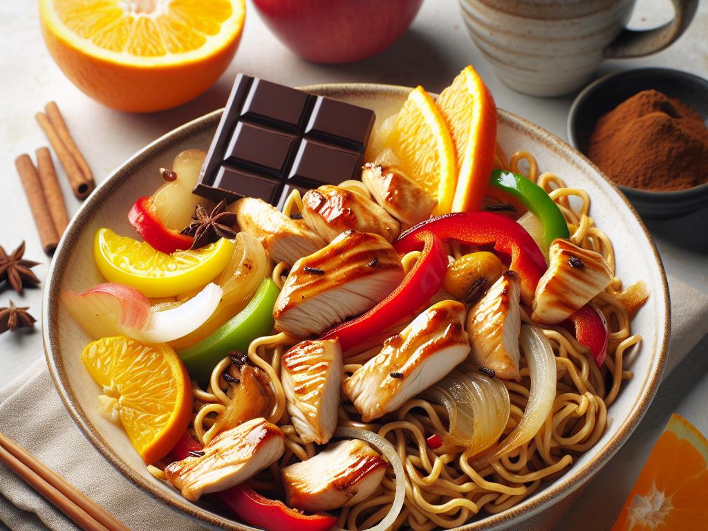 Ce plat est une combinaison délicieuse et équilibrée qui marie la richesse des nouilles sautées au poulet avec la fraîcheur des fruits et une touche de douceur grâce au chocolat noir. Il offre une variété de nutriments essentiels, notamment des protéines maigres, des glucides complexes, des fibres, et des antioxydants. C’est un repas idéal pour maintenir votre énergie tout au long de la journée.