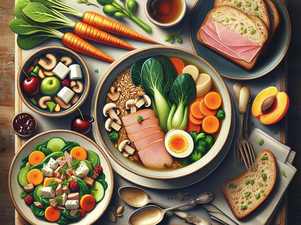 Ce plat est une combinaison délicieuse et équilibrée qui marie les saveurs asiatiques avec des éléments classiques de la cuisine française. Le bouillon asiatique aux légumes est léger et réconfortant, tandis que la salade composée apporte une touche de fraîcheur et de croquant. Le fromage de chèvre et le pain complet ajoutent une dimension crémeuse et rassasiante, et les fruits frais complètent le repas avec une note sucrée et vitaminée. Ce dîner est riche en fibres, protéines et vitamines, parfait pour maintenir une alimentation équilibrée.