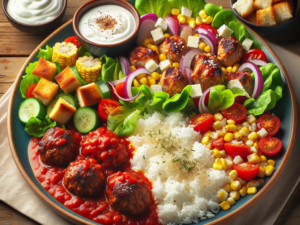 Ce plat équilibré combine des protéines maigres, des glucides complexes et des légumes frais pour un repas complet et nourrissant. Les boulettes de veau apportent des protéines essentielles et du fer, tandis que le riz blanc fournit une source d’énergie rapide. La salade composée ajoute des fibres, des vitamines et des minéraux, et le yaourt nature complète le repas avec une dose de calcium pour la santé des os.