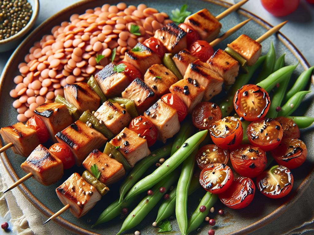 Ce plat est une merveilleuse combinaison de protéines maigres, de légumineuses riches en fibres et de légumes frais. Les brochettes de dinde apportent une bonne dose de protéines essentielles pour la construction musculaire, tandis que les lentilles de corail et les haricots fournissent des fibres et des glucides complexes pour une énergie durable. La vinaigrette aux tomates ajoute une touche de fraîcheur et de saveur, rendant ce repas non seulement équilibré mais aussi délicieux.