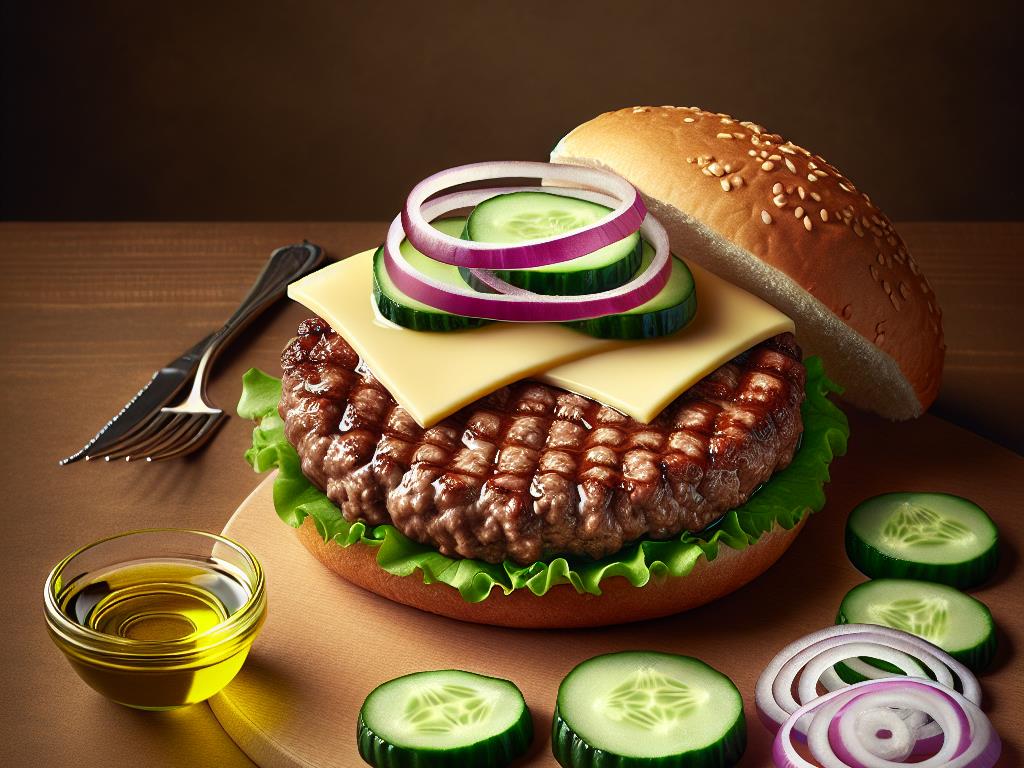Ce burger de bœuf haché à la farine complète est un choix savoureux et équilibré pour un dîner rapide et nutritif. En utilisant du pain à la farine complète, vous bénéficiez de fibres supplémentaires qui aident à la digestion et à la satiété. Le concombre et l’oignon rouge ajoutent une fraîcheur croquante et des antioxydants, tandis que le fromage fondu apporte une touche de crémeux et de calcium. Ce plat est idéal pour ceux qui cherchent à combiner plaisir et nutrition.