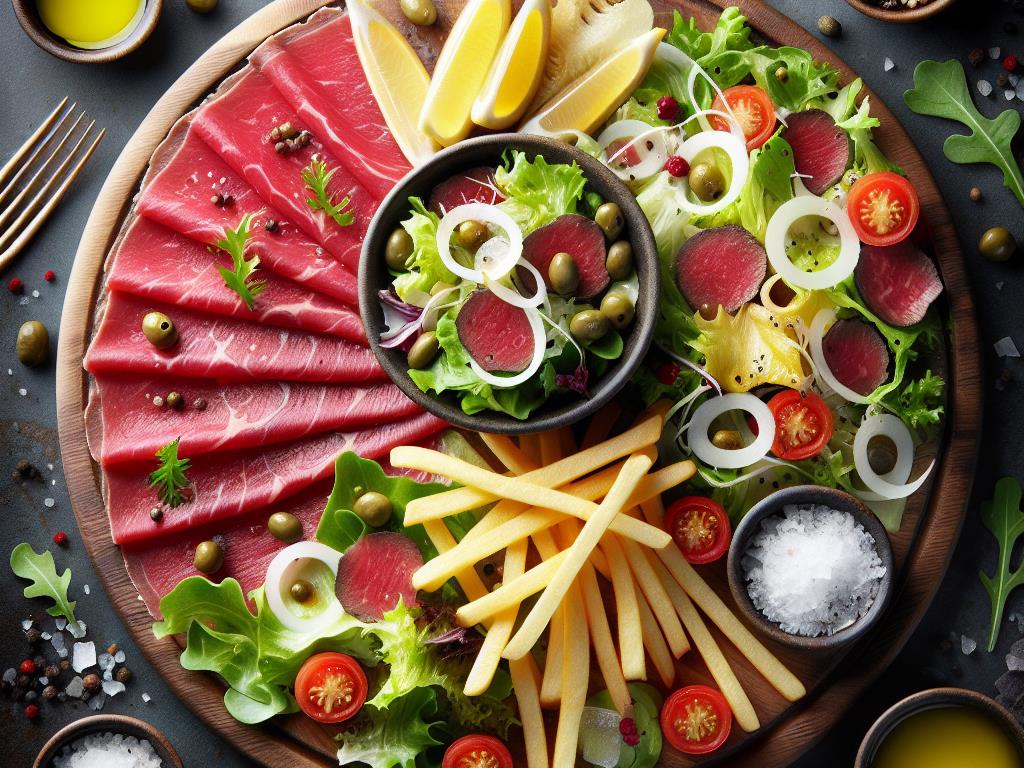 Ce plat de carpaccio de bœuf accompagné d’une salade vinaigrette et de quelques frites est une combinaison délicieuse et équilibrée. Le carpaccio, riche en protéines et faible en matières grasses, est une excellente source de fer et de vitamines B. La salade apporte des fibres et des vitamines essentielles, tandis que les frites, consommées avec modération, ajoutent une touche de gourmandise. Ce repas est idéal pour un déjeuner léger mais satisfaisant, apportant un bon équilibre entre protéines, glucides et lipides.