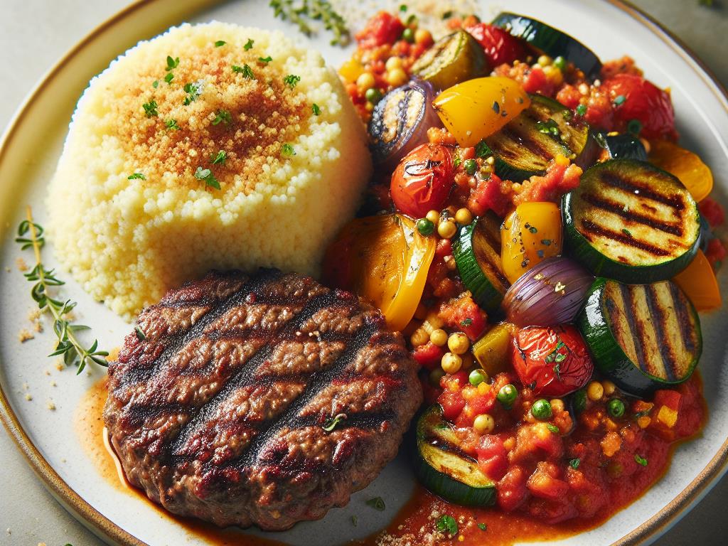 Ce plat équilibré combine des glucides complexes, des protéines maigres et une variété de légumes, offrant ainsi un repas complet et nutritif. Le couscous est une excellente source d’énergie, la galette de bœuf fournit des protéines essentielles pour le maintien des muscles, et la ratatouille en sauce tomate est riche en fibres et en vitamines, contribuant à une bonne digestion et à un apport en antioxydants.