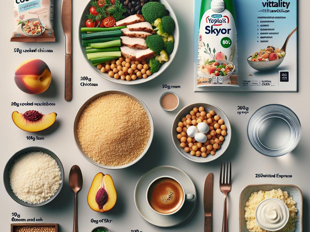 Ce plat est une véritable explosion de saveurs et de nutriments, parfait pour un déjeuner équilibré. La combinaison de semoule, de pois chiches et de légumes surgelés pour couscous offre une base riche en fibres et en glucides complexes. Le filet de poulet et le Skyr apportent des protéines maigres, tandis que la pêche plate blanche ajoute une touche de douceur et de vitamines. Un expresso sans sucre et un verre d’eau complètent ce repas sain et énergisant.