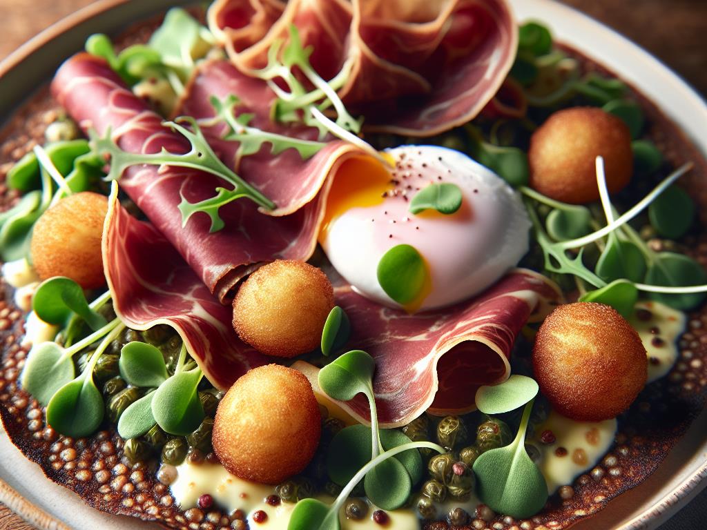 Cette crêpe gourmande est un véritable régal pour les papilles tout en étant équilibrée. Elle combine des protéines de haute qualité grâce à l’œuf poché et la viande séchée, des fibres et des vitamines avec la mâche, et une touche de plaisir avec les petites boules frites. Le fromage apporte du calcium essentiel pour la santé osseuse. Ce plat est idéal pour un déjeuner qui vous maintiendra énergique tout au long de l’après-midi.