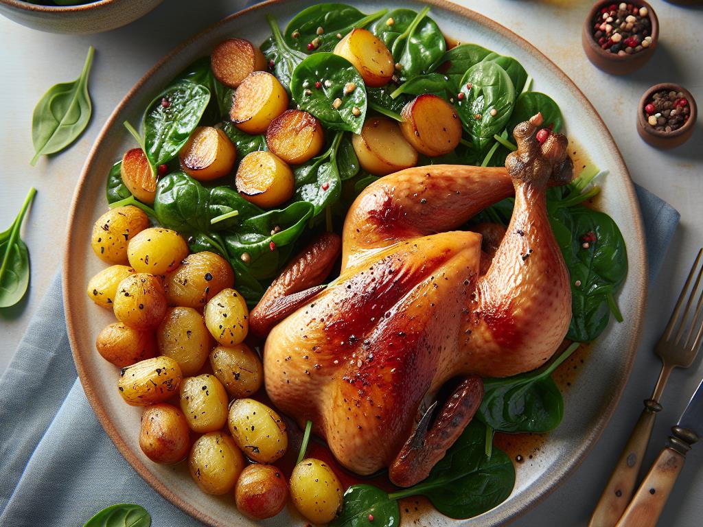 Cuisse de Pintade Rôtie avec Pommes de Terre Sautées et Salade d’Épinards