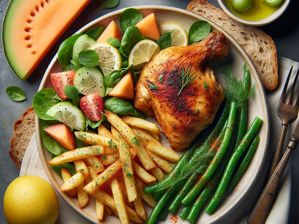 Ce plat savoureux et équilibré combine des protéines maigres, des glucides complexes et des légumes frais pour un repas complet. La cuisse de poulet rôti apporte des protéines essentielles, tandis que les frites maison et le pain complet fournissent l’énergie nécessaire pour la journée. La salade verte, assaisonnée d’une sauce légère au citron et à l’huile d’olive, ajoute une touche de fraîcheur et de fibres. Enfin, une tranche de melon offre une douceur naturelle et une hydratation supplémentaire.