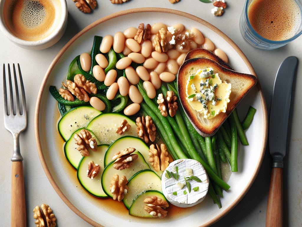 Ce plat est une combinaison savoureuse et équilibrée qui met en avant des ingrédients simples mais nutritifs. Les haricots beurre et la purée de courgette apportent une bonne dose de fibres et de vitamines, tandis que le pain aux noix et le fromage de chèvre frais ajoutent une touche de gourmandise et de protéines. Accompagné d’un expresso sans sucre, ce repas est parfait pour une fin de journée légère et énergisante.