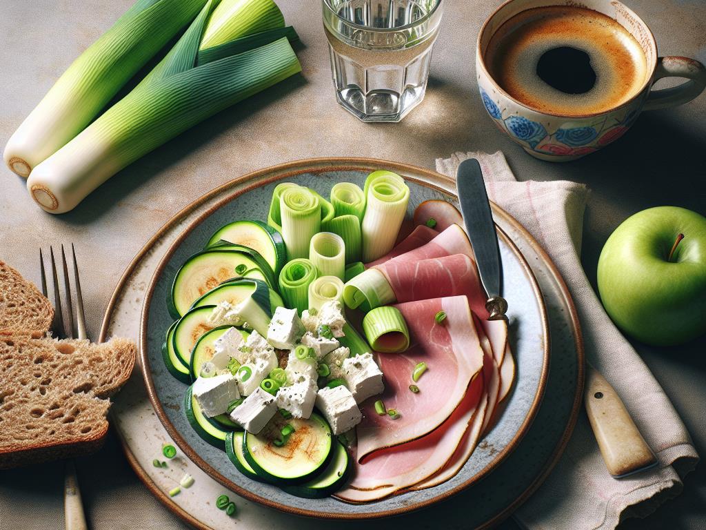 Ce plat est une merveilleuse combinaison de légumes frais, de protéines maigres et de glucides complexes. Il offre un équilibre parfait entre saveurs et nutriments, idéal pour un dîner léger et satisfaisant. Les courgettes et les poireaux apportent des fibres et des vitamines, tandis que le jambon blanc et le fromage de chèvre fournissent des protéines essentielles. Le pain complet complète le repas avec des glucides sains, et la pomme ajoute une touche de douceur naturelle.