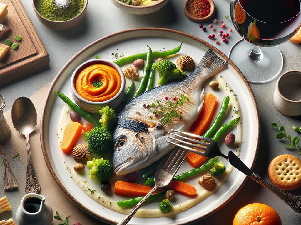 Ce repas apporte environ 600-700 kcal, avec un bon équilibre de macronutriments : protéines de la daurade, glucides complexes de la patate douce, et fibres des légumes. Le verre de vin rouge ajoute une touche d’antioxydants, et le mini biscuit offre une petite douceur pour conclure le repas.