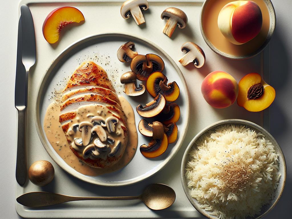 - Servez l’escalope de dinde nappée de la sauce aux champignons, accompagnée du riz basmati. Terminez le repas avec la pêche blanche en dessert.
