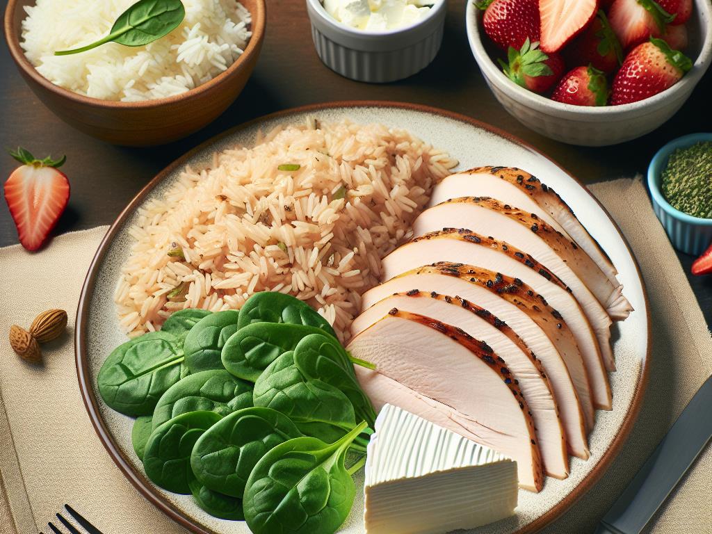 Ce plat est une merveilleuse combinaison de saveurs et de nutriments. Le dindonneau est une excellente source de protéines maigres, tandis que le riz fournit des glucides complexes pour l’énergie. Les épinards ajoutent une touche de verdure riche en vitamines et minéraux, et le fromage blanc vanille 0% avec les fraises offre une fin de repas douce et légère, riche en calcium et en antioxydants. C’est un repas équilibré qui soutient une alimentation saine et variée.