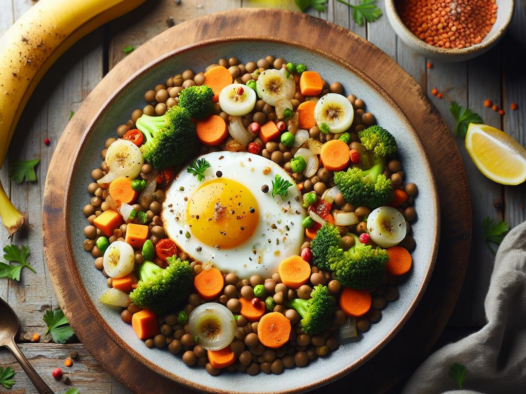Ce plat est une excellente option pour un dîner équilibré et nutritif. Les lentilles de corail sont riches en protéines végétales et en fibres, ce qui favorise la satiété et le bon fonctionnement du système digestif. Les carottes, l’oignon et le brocoli apportent une variété de vitamines et de minéraux essentiels, tandis que l’œuf au plat ajoute une source de protéines de haute qualité. Le filet de vinaigre de cidre et l’huile d’olive extra vierge ajoutent une touche de saveur et de bons acides gras. Enfin, la banane en dessert complète ce repas avec une dose de potassium et de douceur naturelle.