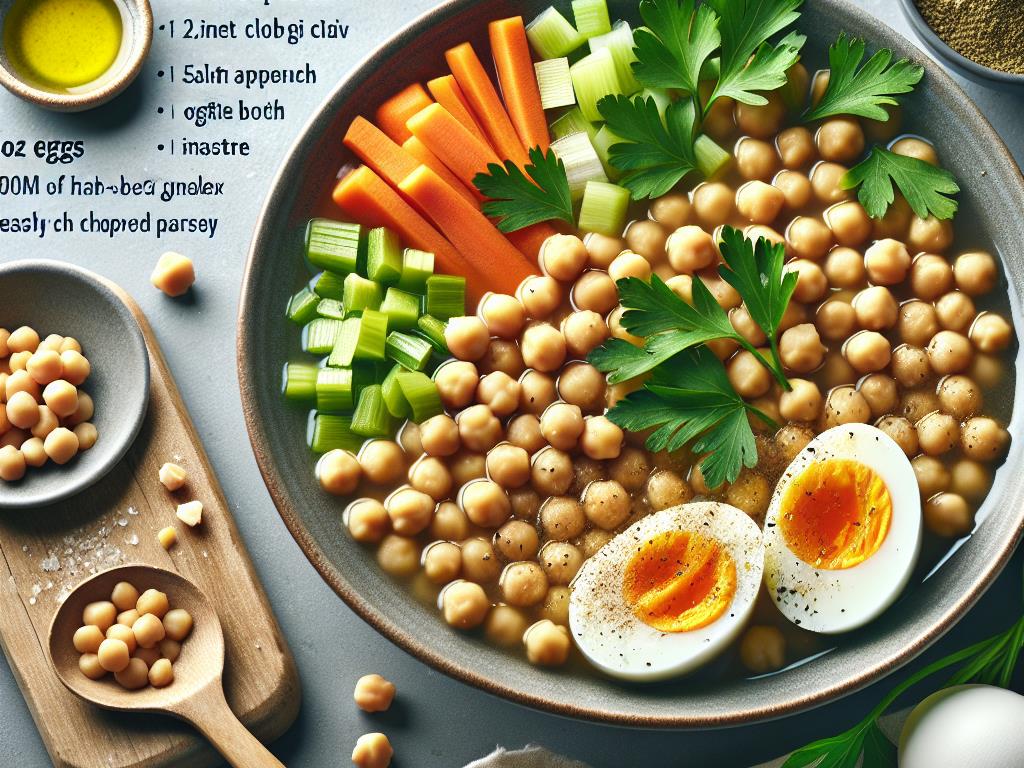 Ce plat est une combinaison parfaite de protéines, de fibres et de nutriments essentiels. La soupe de pois chiche est riche en fibres et en protéines végétales, ce qui favorise la satiété et le bon fonctionnement digestif. Les œufs durs ajoutent une dose supplémentaire de protéines de haute qualité, essentielles pour la réparation et la croissance musculaire. Ce repas équilibré est idéal pour un dîner léger mais nutritif.