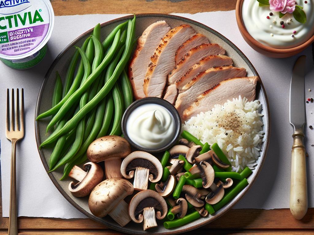 Ce plat savoureux et équilibré combine des protéines maigres, des glucides complexes et des légumes riches en fibres pour un déjeuner complet et nutritif. Les haricots verts et les champignons apportent une bonne dose de vitamines et de minéraux, tandis que le riz blanc fournit l’énergie nécessaire pour tenir toute la journée. Le yaourt Activia Bien-Être Digestif saveur vanille complète le repas avec une touche sucrée et des probiotiques bénéfiques pour la digestion.