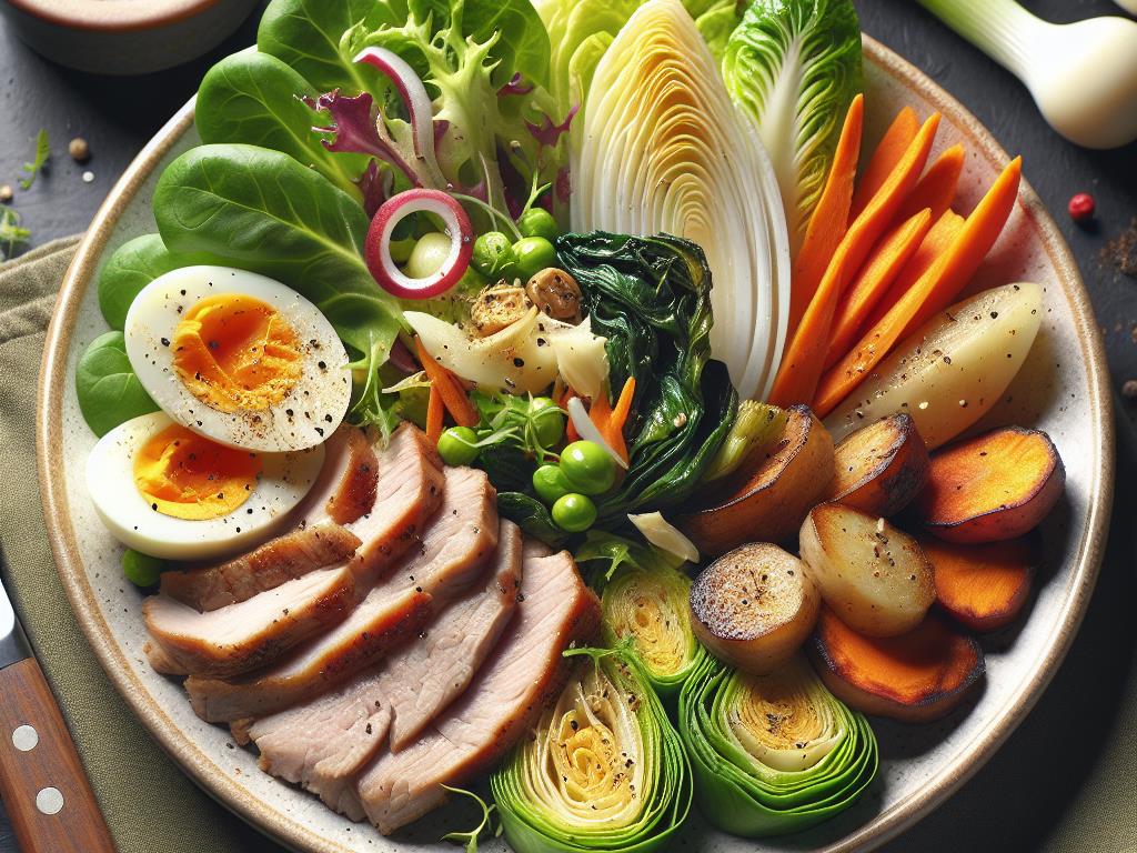 Ce plat est une combinaison savoureuse et équilibrée qui allie protéines, fibres, et glucides complexes. L’œuf dur et le rôti de porc fournissent des protéines essentielles pour la satiété et la réparation musculaire. La salade verte et les endives poêlées apportent des fibres, des vitamines et des minéraux, tandis que les patates douces sont une excellente source de glucides complexes et de bêta-carotène, bénéfique pour la santé des yeux et de la peau.