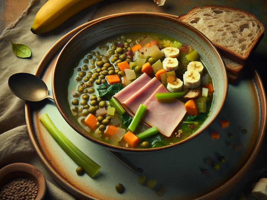Ce plat est une merveilleuse combinaison de saveurs et de nutriments, parfait pour un déjeuner équilibré. Le potage aux légumes et lentilles vertes est riche en fibres et en protéines végétales, ce qui contribue à une bonne satiété. Le pain de mie complet apporte des glucides complexes pour une énergie durable, tandis que le jambon blanc fournit des protéines maigres. Enfin, la banane est une excellente source de potassium et de vitamines, idéale pour compléter ce repas nutritif.