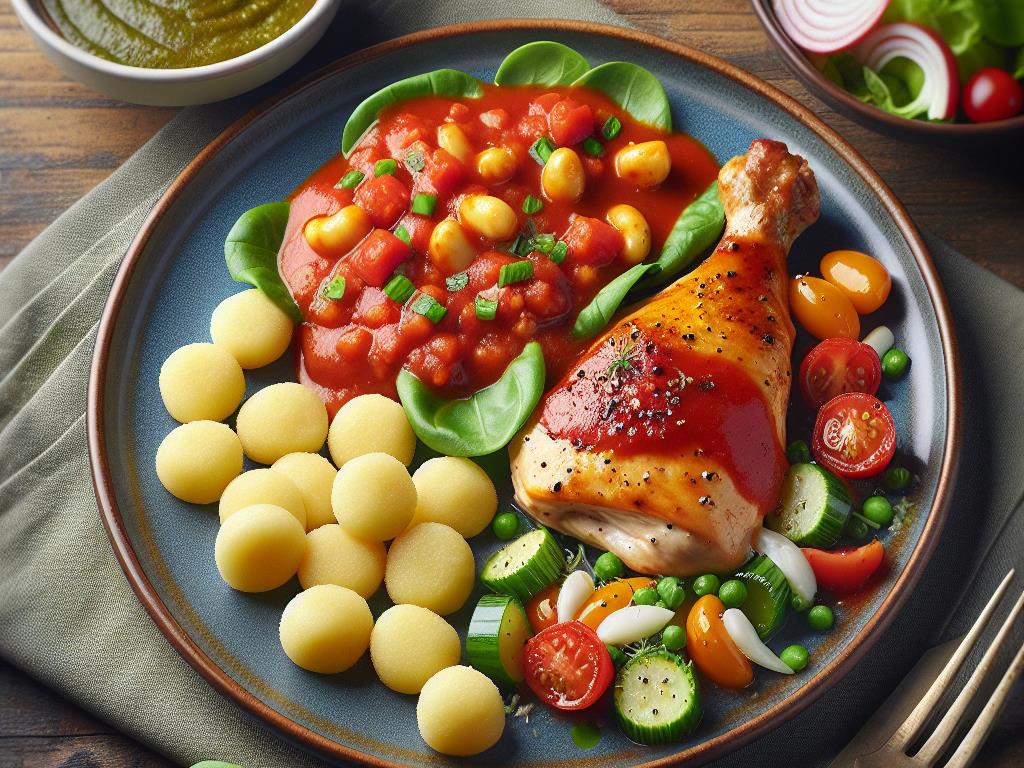 - Servez la cuisse de poulet nappée de sauce tomate avec les gnocchis et la salade verte en accompagnement.