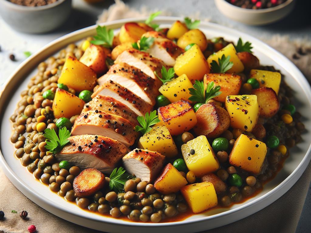 Ce plat est une combinaison savoureuse et nutritive qui allie protéines, fibres et glucides complexes. Les lentilles sont une excellente source de protéines végétales et de fibres, favorisant la satiété et la digestion. Les pommes de terre apportent des glucides complexes pour une énergie durable, tandis que l’escalope de poulet fournit des protéines maigres essentielles pour la construction musculaire et la réparation des tissus. Ensemble, ces ingrédients créent un repas équilibré et délicieux.