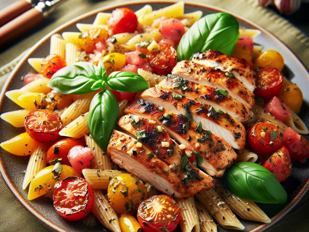 Délice de Poulet Grillé aux Tomates Herbacées et Pâtes