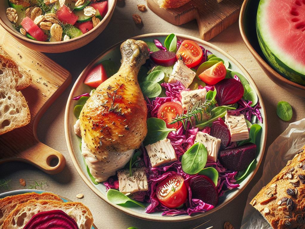 Ce plat est une combinaison savoureuse et équilibrée qui marie des légumes croquants, des protéines maigres et des produits laitiers pour un repas complet. La salade de chou rouge et de betterave apporte une bonne dose de fibres et d’antioxydants, tandis que le poulet fournit des protéines essentielles. La tomme de Savoie et le pain aux céréales ajoutent une touche de gourmandise et d’énergie, et la pastèque offre une note de fraîcheur sucrée pour conclure ce repas en beauté.