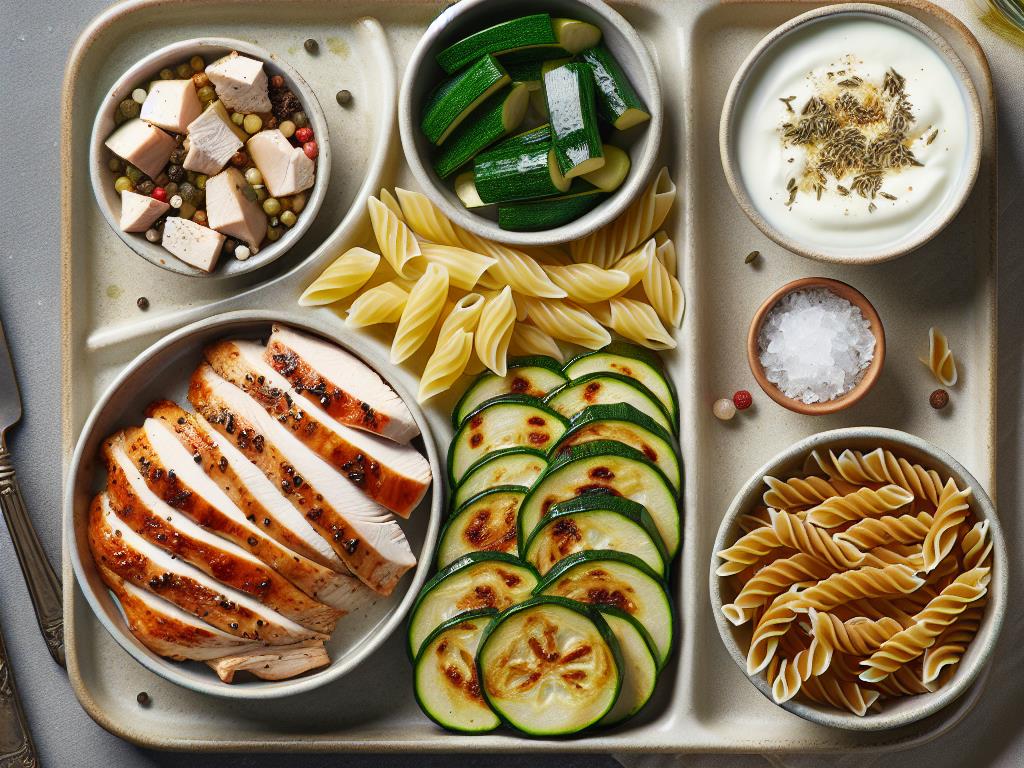 Ce plat est une combinaison savoureuse et équilibrée qui allie protéines maigres, légumes riches en fibres, et glucides complexes. Le poulet rôti apporte des protéines essentielles pour la construction musculaire, tandis que les courgettes fournissent des vitamines et des minéraux importants. Les pâtes complètent ce repas en offrant une source d’énergie durable. Le yaourt nature en dessert ajoute une touche de calcium et de probiotiques pour une digestion saine.