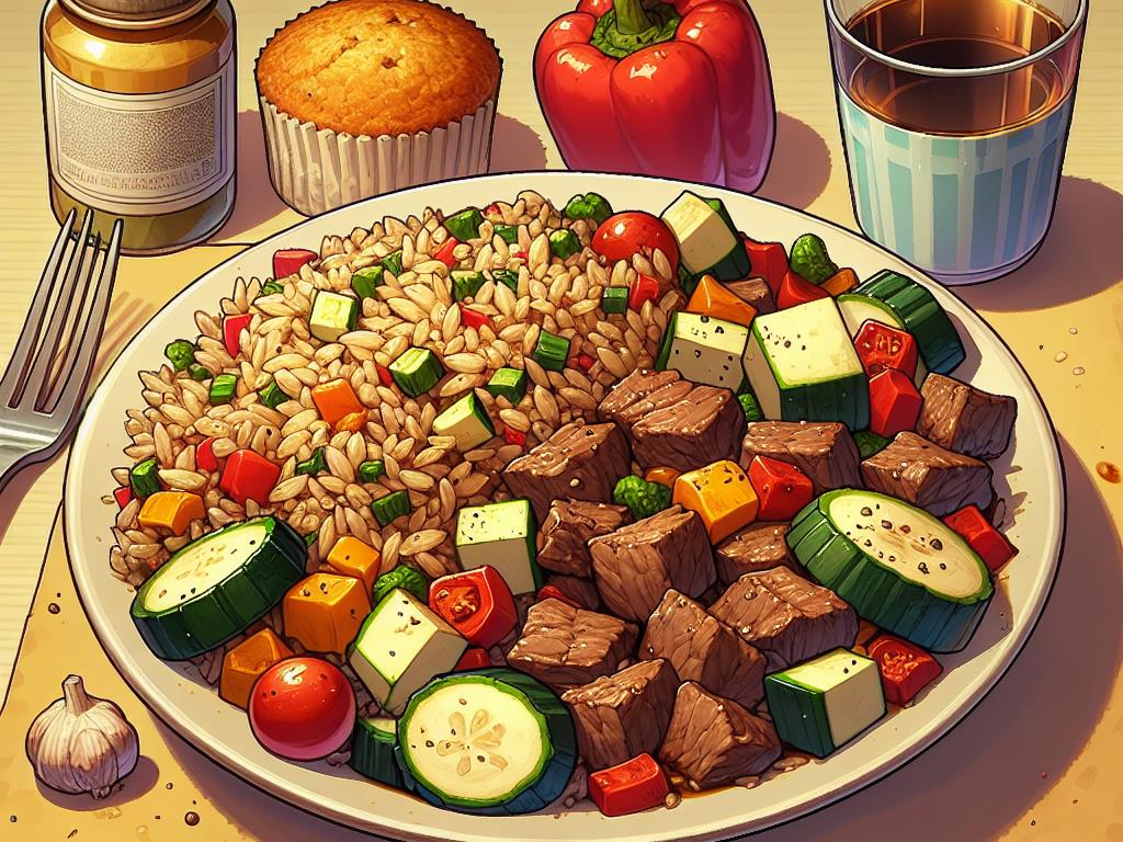 Ce plat est une combinaison savoureuse et équilibrée qui marie les bienfaits des légumes frais, des protéines maigres et des glucides complexes. Le riz fournit une source d’énergie durable, tandis que les courgettes et les poivrons ajoutent des fibres, des vitamines et des antioxydants. Le bœuf, riche en protéines et en fer, complète ce repas nutritif. Le gâteau maison, en dessert, permet de terminer sur une note sucrée tout en contrôlant les ingrédients pour un plaisir sain.