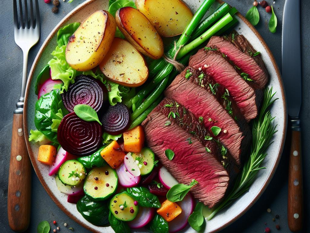 - Disposez le rosbif, les pommes de terre vapeur, la salade verte avec betterave et les endives braisées sur une assiette. Garnissez de quelques herbes fraîches pour la touche finale.