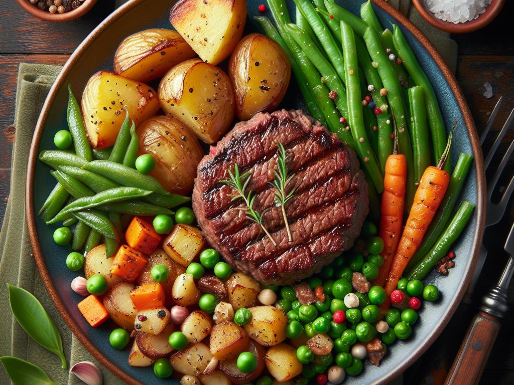 Ce plat est une combinaison savoureuse et équilibrée qui offre une excellente source de protéines, de fibres et de vitamines. Les pommes de terre rôties apportent des glucides complexes pour l’énergie, tandis que le steak haché fournit des protéines essentielles pour la construction musculaire. Les haricots verts, carottes et petits pois ajoutent une variété de nutriments, de fibres et de couleurs à votre assiette, faisant de ce repas un choix sain et délicieux.
