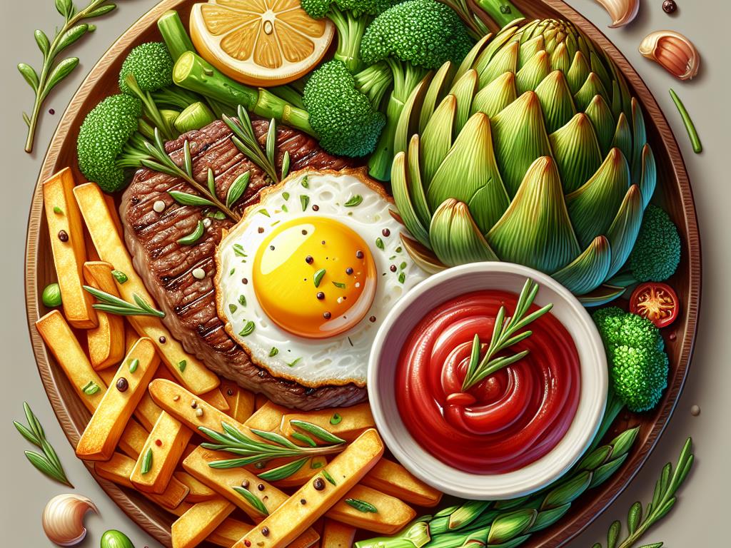 Ce plat est une combinaison savoureuse et équilibrée qui marie protéines, glucides et légumes. Le steak haché et l’œuf au plat fournissent des protéines essentielles pour la construction musculaire, tandis que les frites au four offrent une source d’énergie sous forme de glucides complexes. Les brocolis et les artichauts ajoutent une touche de fibres et de vitamines, contribuant à une digestion saine et à un apport en micronutriments. Une pointe de ketchup apporte une touche de saveur sans excès de calories.