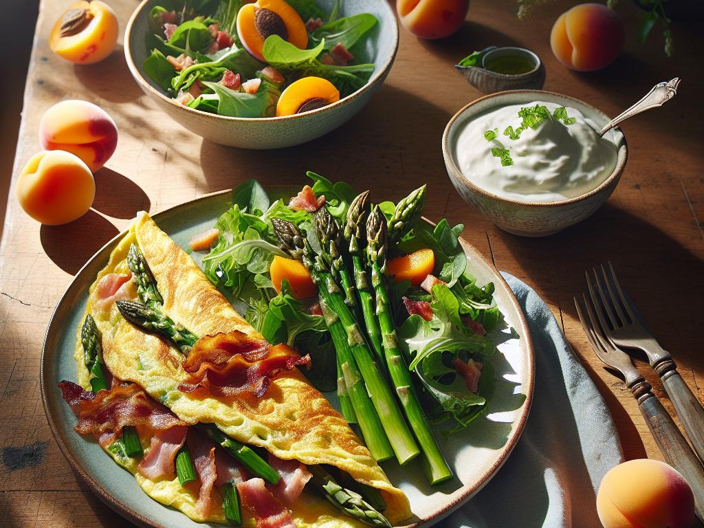 Ce plat est une combinaison parfaite de saveurs et de nutriments. L’omelette aux asperges et bacon apporte une bonne dose de protéines et de fibres, tandis que la salade verte rafraîchissante complète le repas avec des vitamines et des minéraux essentiels. Le yaourt nature et les abricots offrent une touche sucrée et crémeuse pour terminer le repas en beauté. C’est un dîner équilibré qui soutient la santé digestive et fournit de l’énergie durable.