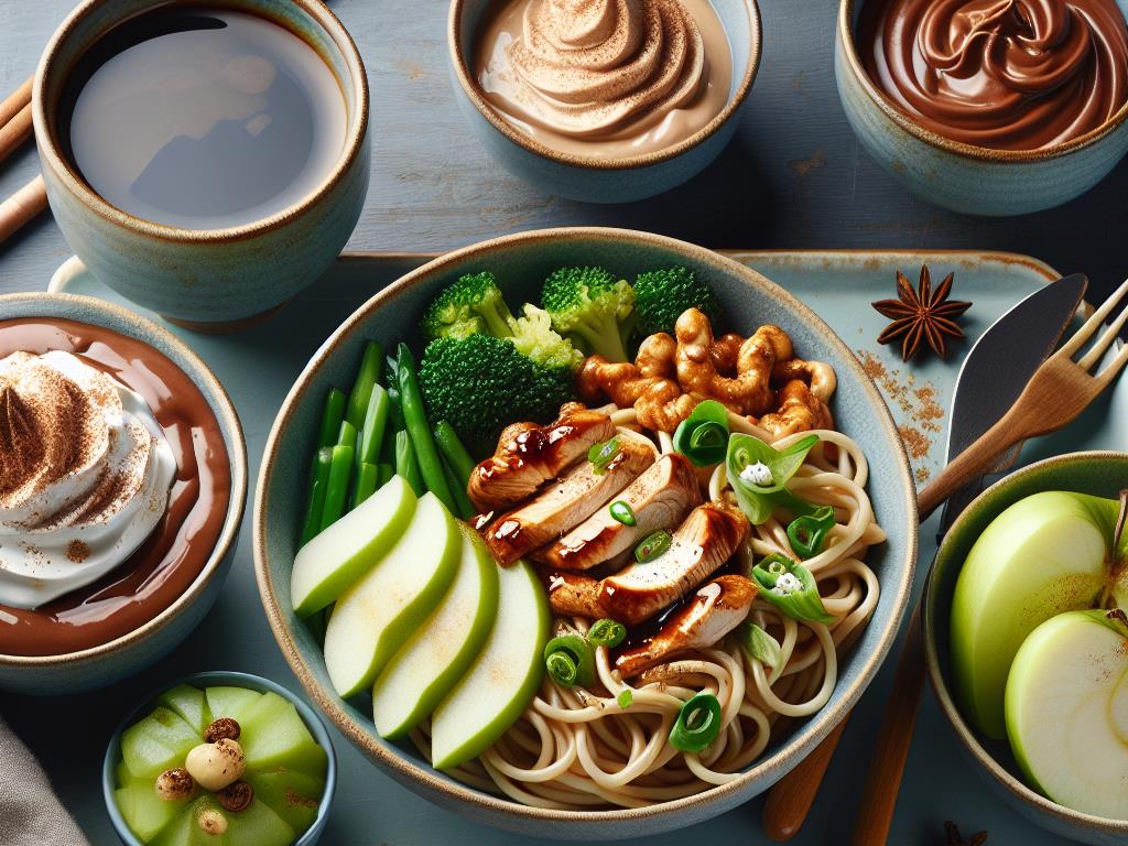 Nouilles Teriyaki, Légumes Verts, Mousse Protéinée Chocolat, Yaourt Protéiné, Pomme, Crème de Coco, Cannelle