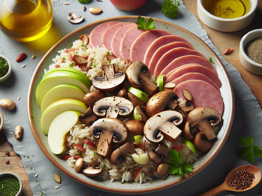 Ce plat est une excellente option pour un dîner équilibré et nutritif. Il combine des protéines végétales, des glucides complexes, et des fibres, tout en étant faible en matières grasses. Le jambon végétal et le skyr apportent des protéines essentielles, tandis que le riz complet et les champignons fournissent des fibres et des vitamines. La pomme ajoute une touche de fraîcheur et de douceur naturelle, complétant parfaitement ce repas sain.
