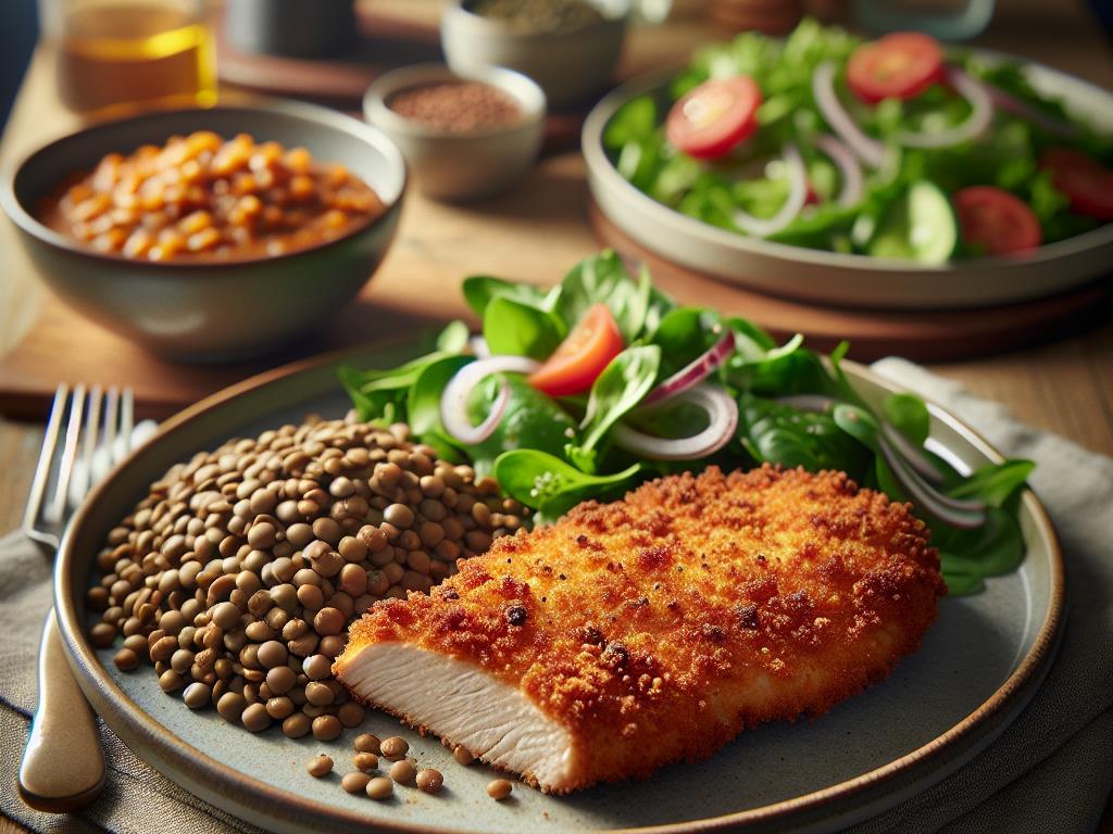 Ce plat équilibré combine des protéines maigres, des fibres et des légumes frais pour un déjeuner satisfaisant et nutritif. L’escalope de dinde panée apporte une texture croustillante, tandis que les lentilles fournissent des glucides complexes et des fibres pour une énergie durable. La salade croquante, accompagnée d’une touche de vinaigre balsamique, ajoute une fraîcheur bienvenue. Terminez avec un yaourt nature pour un apport en calcium et en probiotiques bénéfiques pour la digestion.