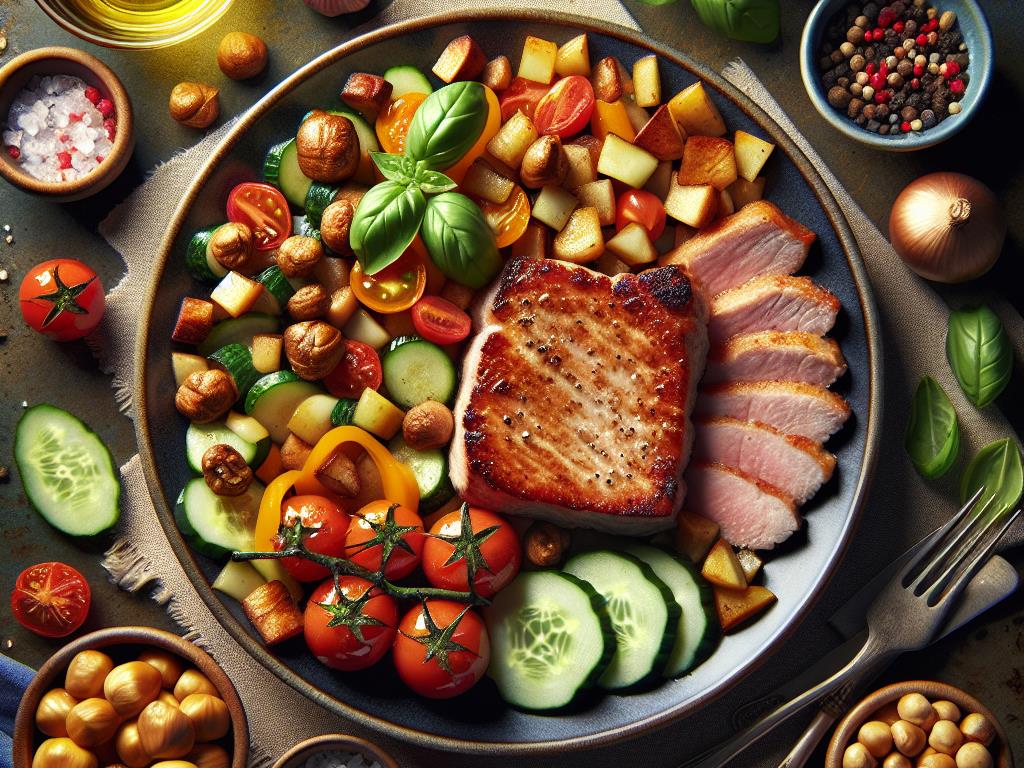 Ce plat est une combinaison savoureuse et équilibrée qui met en valeur la tendreté de l’escalope de porc, la fraîcheur des légumes et la douceur des marrons. Riche en protéines, fibres et vitamines, ce repas est idéal pour maintenir une alimentation saine et variée. Les tomates et les concombres apportent une touche de fraîcheur, tandis que les marrons ajoutent une texture et une saveur uniques.