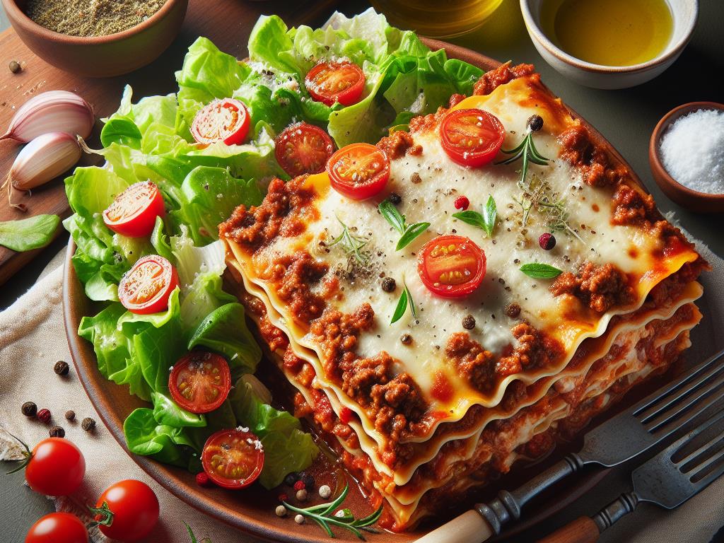 La lasagne maison accompagnée d’une salade verte et de tomates cerises est un repas équilibré qui combine des glucides complexes, des protéines, et des fibres. Ce plat offre une belle harmonie entre les saveurs riches de la lasagne et la fraîcheur de la salade, tout en apportant les nutriments essentiels pour un déjeuner complet et satisfaisant.