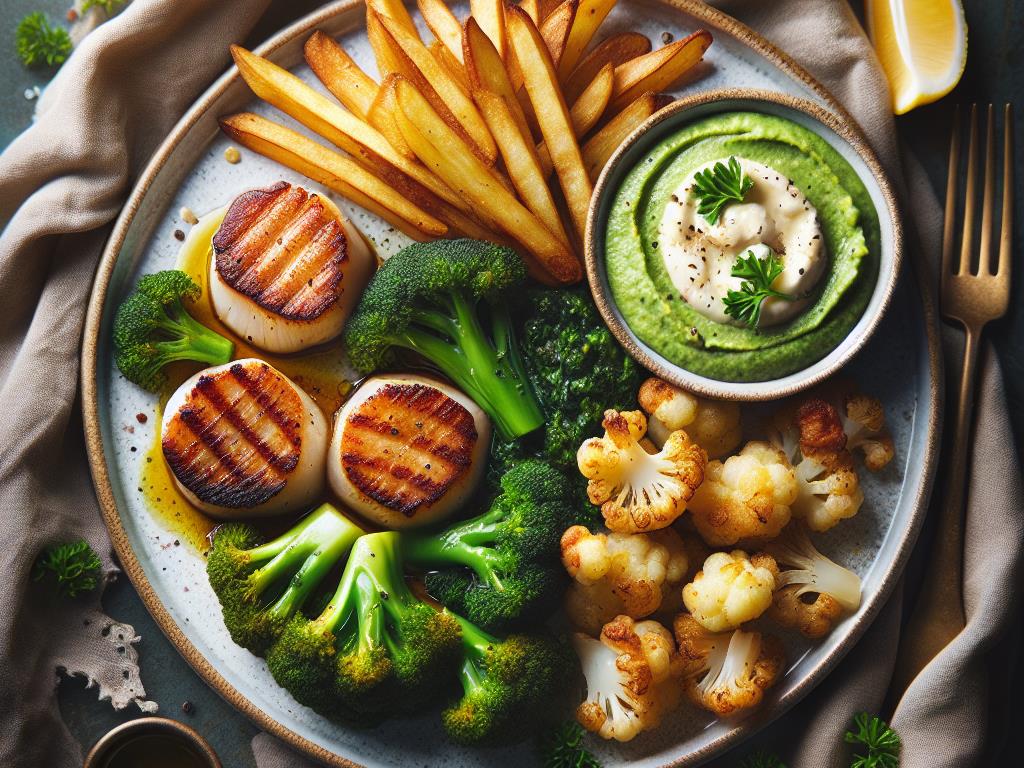 Ce plat est une combinaison délicieuse et nutritive qui met en valeur les saveurs subtiles des noix de Saint-Jacques, accompagnées d’une purée de brocoli crémeuse, de chou-fleur rôti croustillant et de pommes de terre sautées dorées. Il offre un équilibre parfait entre protéines, fibres et glucides, tout en étant riche en vitamines et minéraux essentiels. Un choix idéal pour un dîner sain et savoureux.