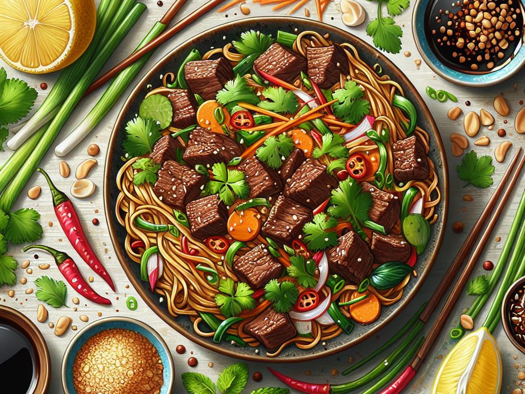 Ce plat de nouilles au bœuf sautées à la thaï est une explosion de saveurs et de textures. Il combine des protéines maigres, des glucides complexes, et une variété de légumes pour un repas équilibré. Les épices et les herbes fraîches comme la coriandre et la menthe ajoutent non seulement du goût, mais aussi des antioxydants bénéfiques pour la santé. Ce plat est parfait pour un dîner rapide et nutritif.