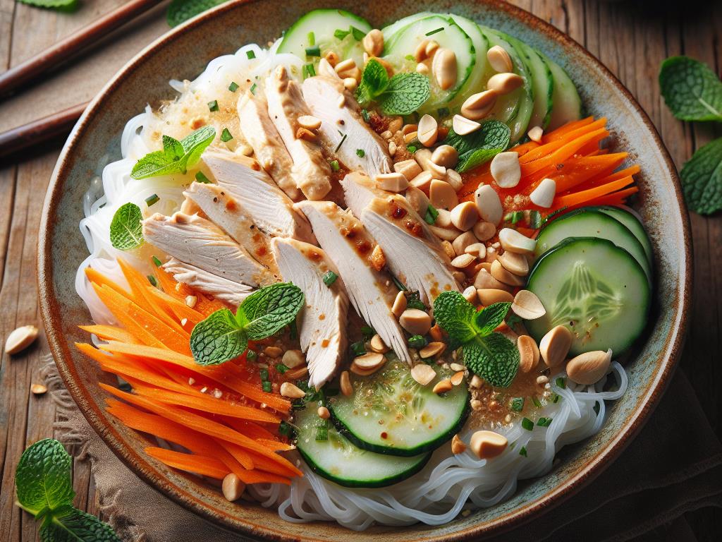 Ce plat de nouilles de riz avec poulet, carotte, concombre, sauce poisson, menthe, et cacahuètes non salées est une option délicieuse et équilibrée pour un dîner. Il combine des protéines maigres, des glucides complexes, et une variété de légumes frais pour un repas complet. La menthe et la sauce poisson ajoutent une touche de fraîcheur et de saveur, tandis que les cacahuètes apportent une texture croquante et une source saine de graisses. C’est un plat qui non seulement satisfait le palais, mais aussi nourrit le corps de manière équilibrée.