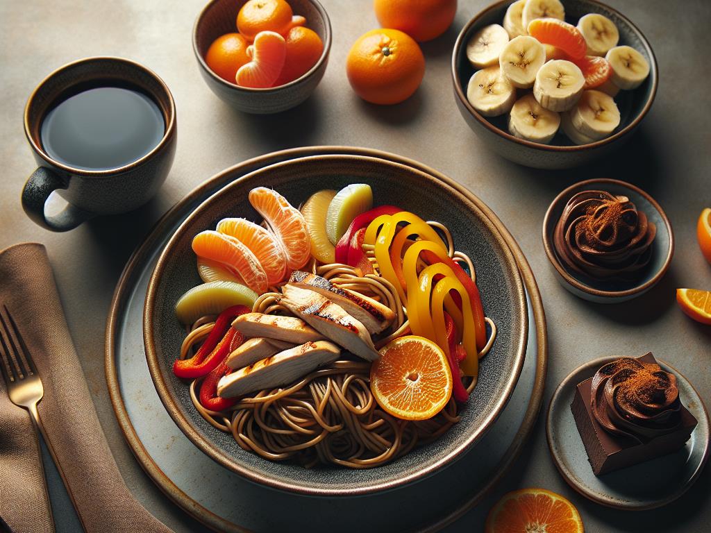 Ce plat de nouilles sautées au poulet est une option savoureuse et équilibrée pour un déjeuner nutritif. Il combine des protéines maigres, des glucides complexes, et une variété de fruits pour un apport en vitamines et minéraux. La touche finale de mousse au chocolat apporte une douceur gourmande tout en restant dans une portion contrôlée. C’est un repas qui soutient l’énergie tout au long de la journée tout en satisfaisant les papilles.