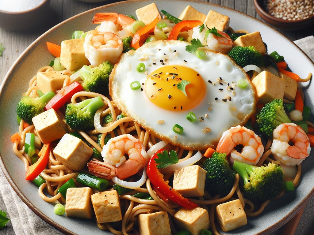 Ce plat de nouilles sautées est une option délicieuse et équilibrée pour un dîner nutritif. Il combine des protéines maigres provenant du tofu et des crevettes, des glucides complexes des nouilles, et une variété de légumes pour un apport en fibres et vitamines. L’œuf au plat ajoute une touche de richesse et de satiété. Ce repas est faible en matières grasses, mais riche en saveurs et en nutriments essentiels.
