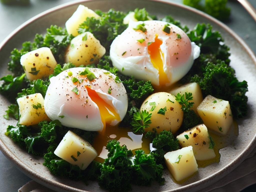 Ce plat est une combinaison délicieuse et nutritive qui allie la richesse des œufs pochés à la fraîcheur du chou frisé et la douceur des pommes de terre persillées. Les œufs sont une excellente source de protéines de haute qualité, tandis que le chou frisé est riche en vitamines A, C et K, ainsi qu’en antioxydants. Les pommes de terre apportent des glucides complexes pour l’énergie, et le persil ajoute une touche de fraîcheur et de vitamine C. Ce repas est non seulement équilibré mais aussi satisfaisant, parfait pour un déjeuner nourrissant.