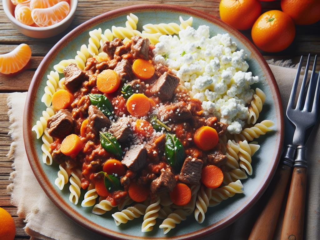 Ce plat de pâtes à la bolognaise maison est une option délicieuse et équilibrée pour un déjeuner nutritif. Riche en protéines grâce au steak haché et au fromage blanc, il fournit également des fibres et des vitamines grâce aux légumes et à la mandarine. C’est un repas complet qui vous apportera l’énergie nécessaire pour affronter le reste de la journée.