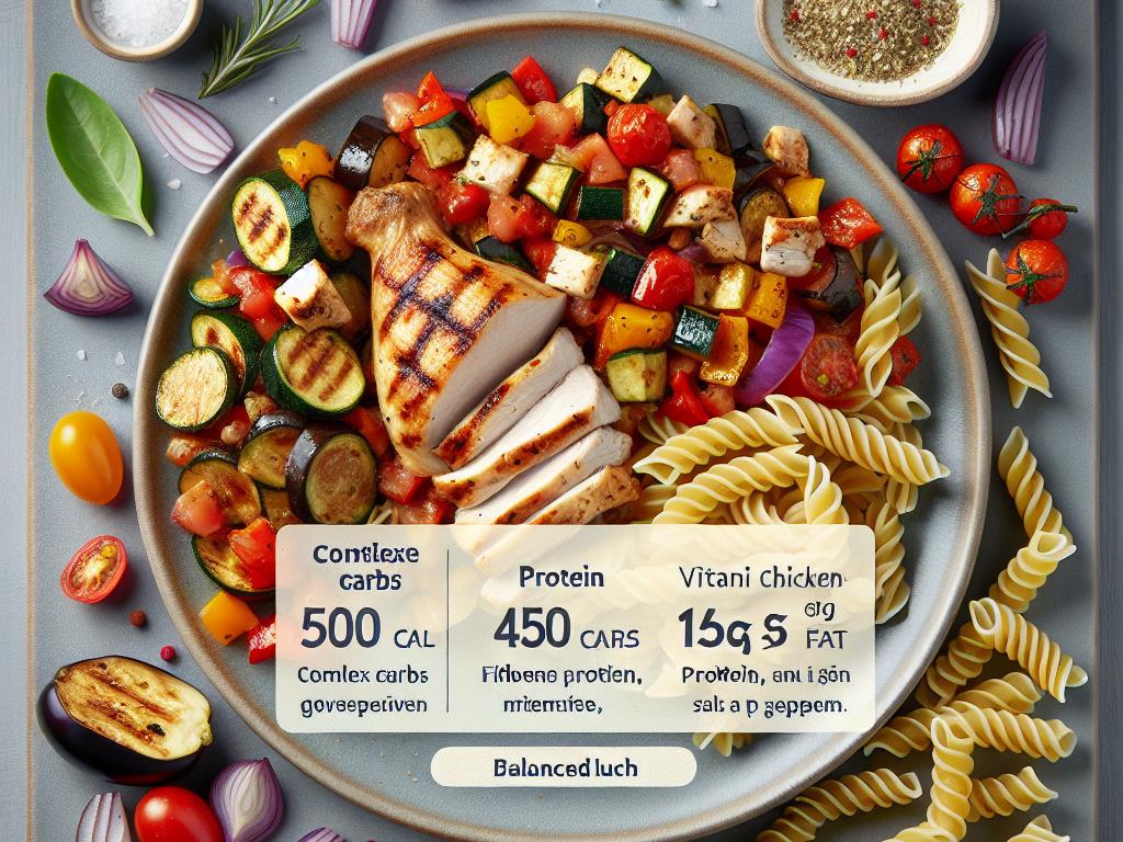 Ce plat est une excellente option pour un déjeuner équilibré, combinant des glucides complexes, des protéines maigres et une variété de légumes. Les pâtes fournissent l’énergie nécessaire pour la journée, tandis que la ratatouille apporte des fibres et des vitamines essentielles. Le poulet grillé est une source de protéines maigres, aidant à la réparation et à la croissance musculaire.