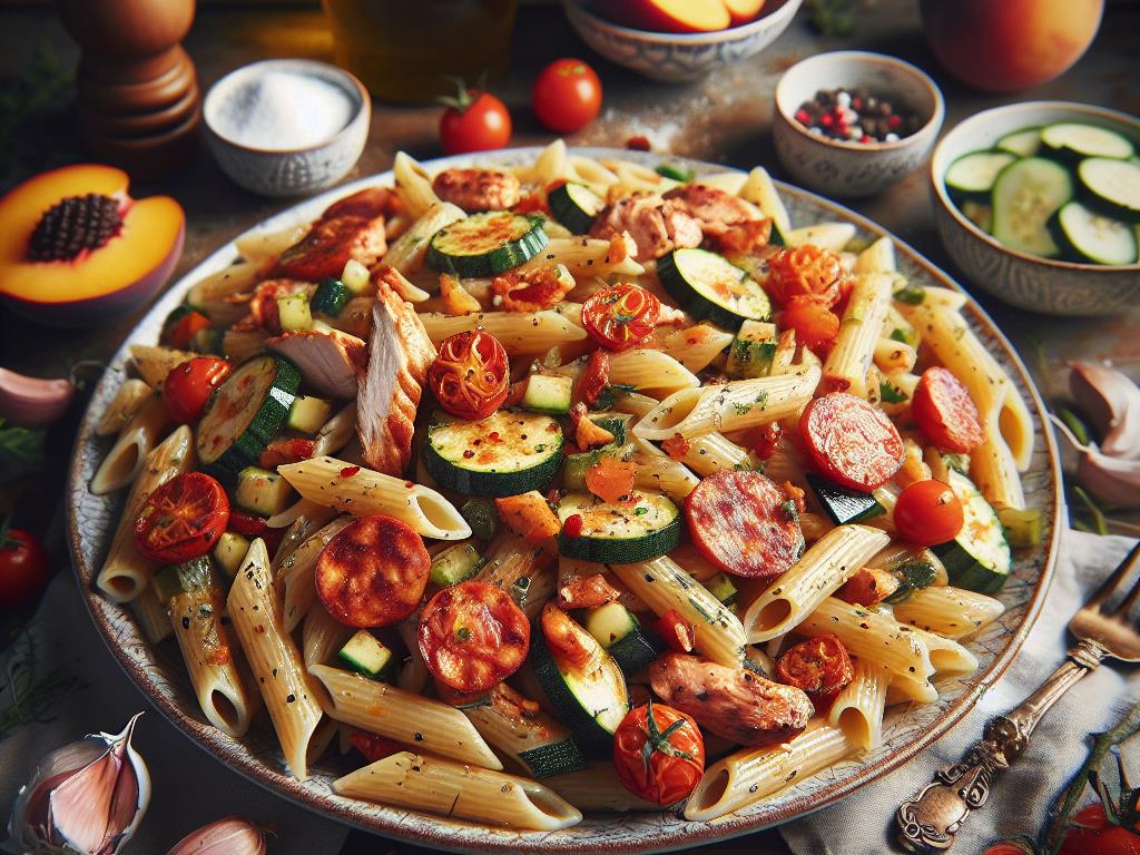 Ce plat de pâtes au poulet et chorizo, agrémenté de légumes frais, est une option savoureuse et équilibrée pour un déjeuner nutritif. Les pâtes fournissent une bonne source de glucides pour l’énergie, tandis que le poulet et le chorizo ajoutent des protéines essentielles. Les légumes, tels que les courgettes et les tomates cerises, apportent des fibres et des vitamines, complétant ainsi ce repas pour une alimentation saine et équilibrée.