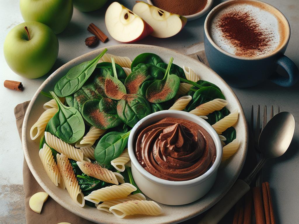 Ce plat est une combinaison parfaite de saveurs et de nutriments, idéal pour un déjeuner équilibré. Les pâtes aux épinards fournissent une bonne dose de glucides complexes et de fibres, tandis que la mousse choco protéinée offre une source de protéines qui aide à maintenir la satiété. La pomme ajoute une touche de fraîcheur et de vitamines, et le café à la cannelle complète ce repas avec une note réconfortante et stimulante. Ce repas est non seulement délicieux mais aussi bénéfique pour maintenir un bon niveau d’énergie tout au long de la journée.