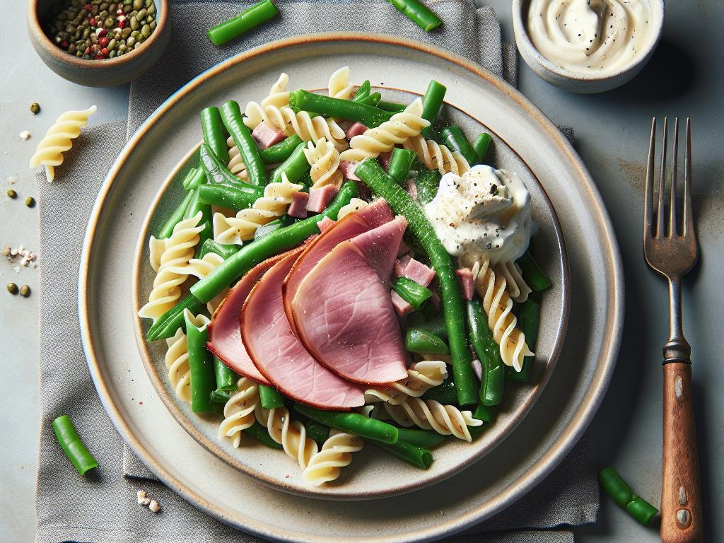 Ce plat est une option savoureuse et équilibrée qui combine des glucides complexes, des protéines maigres et des fibres. Les pâtes fournissent l’énergie nécessaire pour la journée, tandis que les haricots verts ajoutent des fibres et des vitamines. Le jambon blanc apporte des protéines maigres, et le skyr, riche en protéines et faible en matières grasses, complète parfaitement ce repas. C’est une excellente option pour un déjeuner qui vous maintiendra rassasié et énergisé.