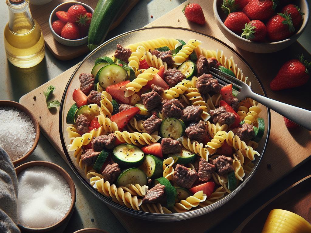 Ce plat est un excellent choix pour un déjeuner équilibré, combinant des glucides complexes, des protéines maigres et des fibres. Les pâtes fournissent l’énergie nécessaire pour l’après-midi, tandis que les légumes ajoutent des vitamines et des minéraux essentiels. Le steak haché apporte une bonne dose de protéines, et le yaourt nature avec des fraises en dessert complète ce repas avec une touche de douceur et de fraîcheur.