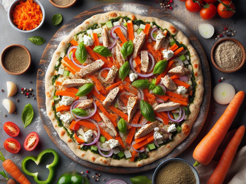Cette pizza maison est une option délicieuse et équilibrée pour un déjeuner nutritif. La pâte à base de farine complète apporte des fibres essentielles, tandis que le poulet fournit des protéines maigres. Les légumes comme les carottes, les poivrons et les oignons ajoutent des vitamines et des minéraux, et le fromage de chèvre offre une touche crémeuse sans excès de matières grasses. C’est un plat qui combine plaisir et santé, idéal pour une alimentation équilibrée.